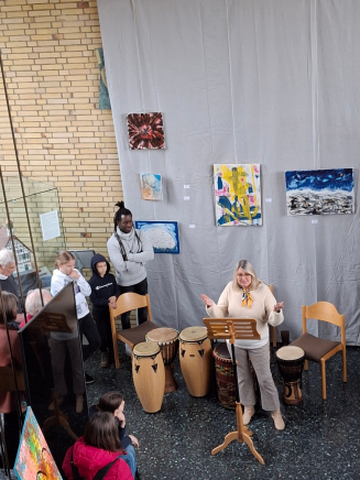 Mit erfreulichem Besucherandrang begann dieses Jahr die Ausstellung des Künstlerforums. Da das Rathaus in Waldenbuch gerade noch renoviert wird, hatte Steinenbronn die Tore seines Rathauses für uns geöffnet. Nachdem eine kleine Gruppe der Schlagzeugklasse der Musikschule Waldenbuch bestehend aus dem Lehrer und zwei Kindern den Auftakt mit mitreißenden Rhythmen gemacht hatte, begrüßte Herr Dr. Schneider, der 1. Vorsitzende des Vereins, die Anwesenden und bedankte sich bei der Gemeinde Steinenbronn. Herr Habakuk, der Bürgermeister, folgte und zeigte sich erfreut, diese die Gemeinden verbindende Veranstaltung in seinen Räumen zu haben. In den Gedanken zur Ausstellung ging Frau Maj auf das Motto „ DIES UND DAS“ ein. Das Wichtigste sei das „Und“, das alles, auch die Gegensätze verbinde.